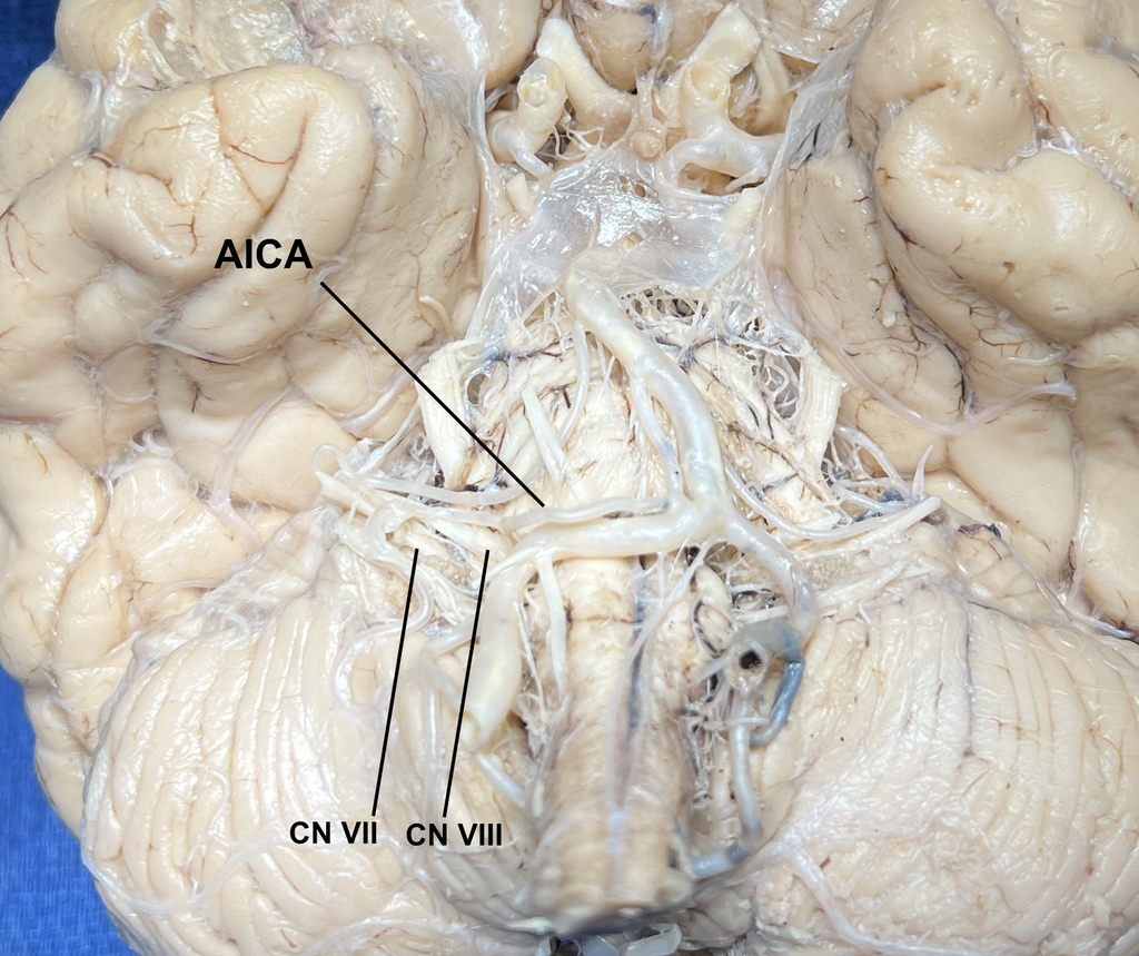 That's correct! An AICA occlusion usually injures CN VII and VIII as they exit the dorsolateral caudal pons. But that would cause dizziness, ipsilateral hearing loss, as well as ipsilateral facial paralysis. This patient doesn't seem to have those signs and symptoms. And what about the diploplia? Recall the three nerves that innervate the eye muscles and make another choice.