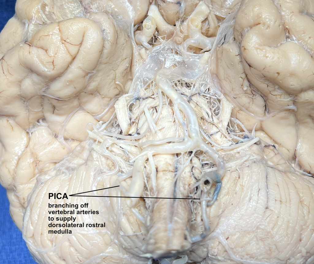 CN IX and X exit the dorsolateral rostral medulla and so it would be an occlusion of the posterior inferior cerebellar artery (PICA), not AICA, that would injure these. Also, damage to the vagus nerve would lead to hoarseness, an ipsilateral paralyzed soft palate, and dysphagia, none of which was mentioned. Select a different nerve that is more likely to be involved.