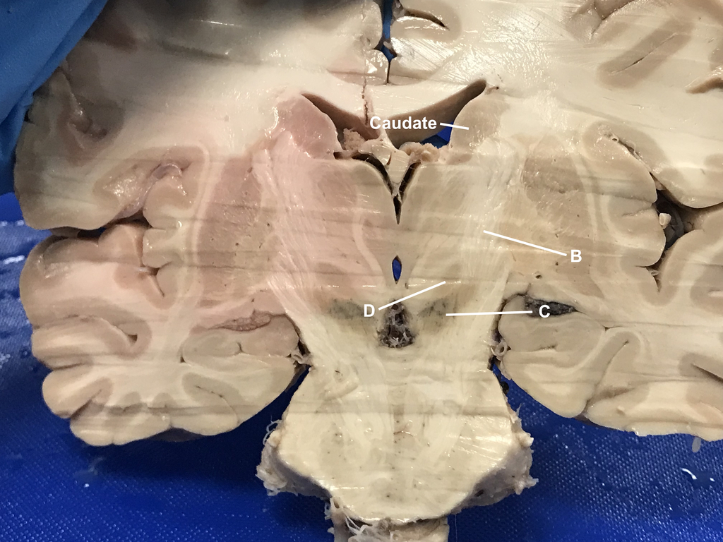 A: I'm sorry, that's not correct. This is the caudate nucleus which is the entry nucleus for the cognitive limb of the basal ganglia and a lesion here would not lead to the hyperkinetic motor disorder described.